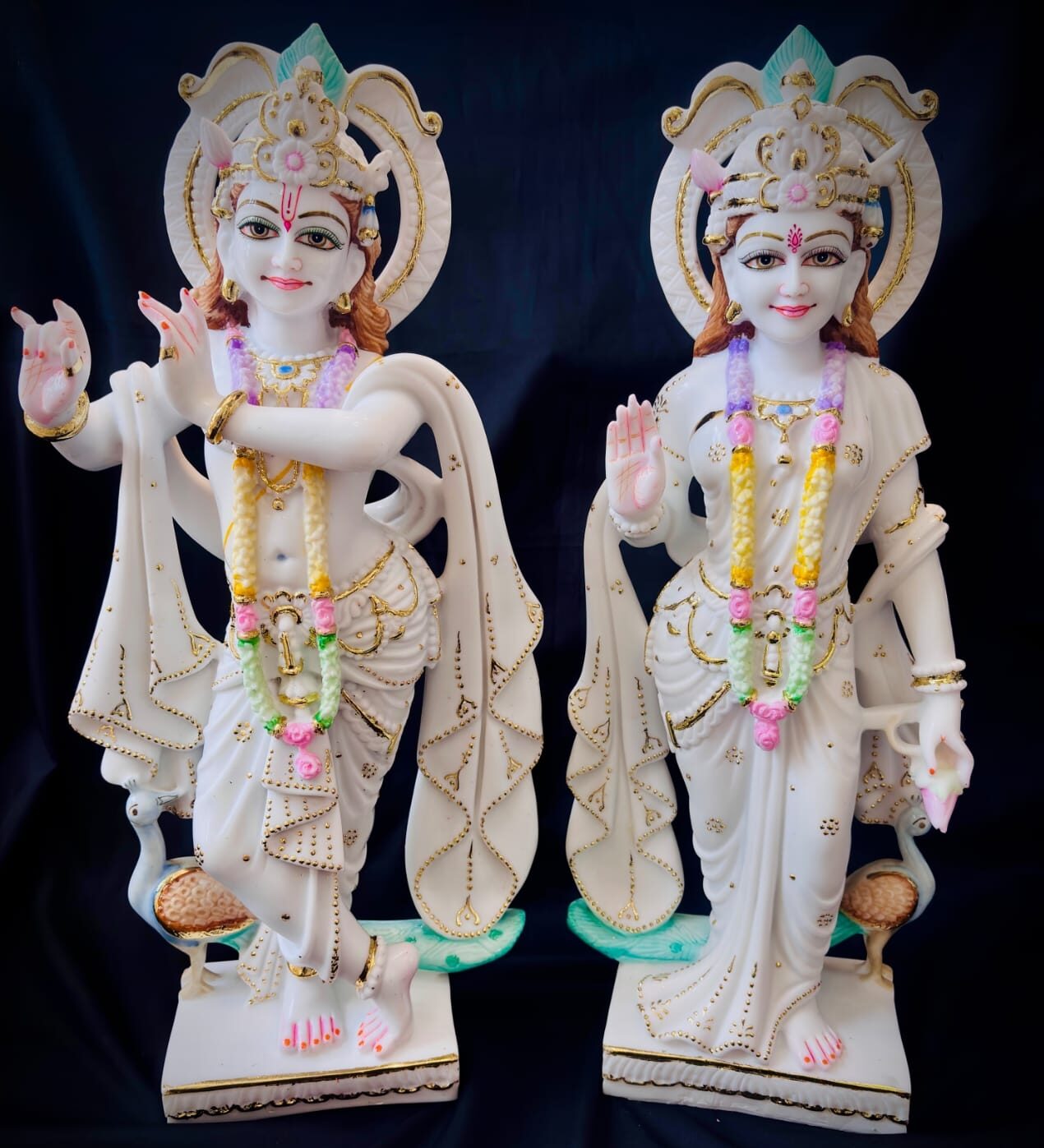 EXPERIENCE THE DIVINE UNION OF LORD KRISHNA AND RADHA WITH THIS EXQUISITELY HANDCRAFTED IDOL. MADE FROM PREMIUM MARBLE DUST AND ENHANCED WITH INTRICATE GOLD LEAF WORK, THIS MASTERPIECE REFLECTS LOVE, DEVOTION, AND SPIRITUAL BLISS.