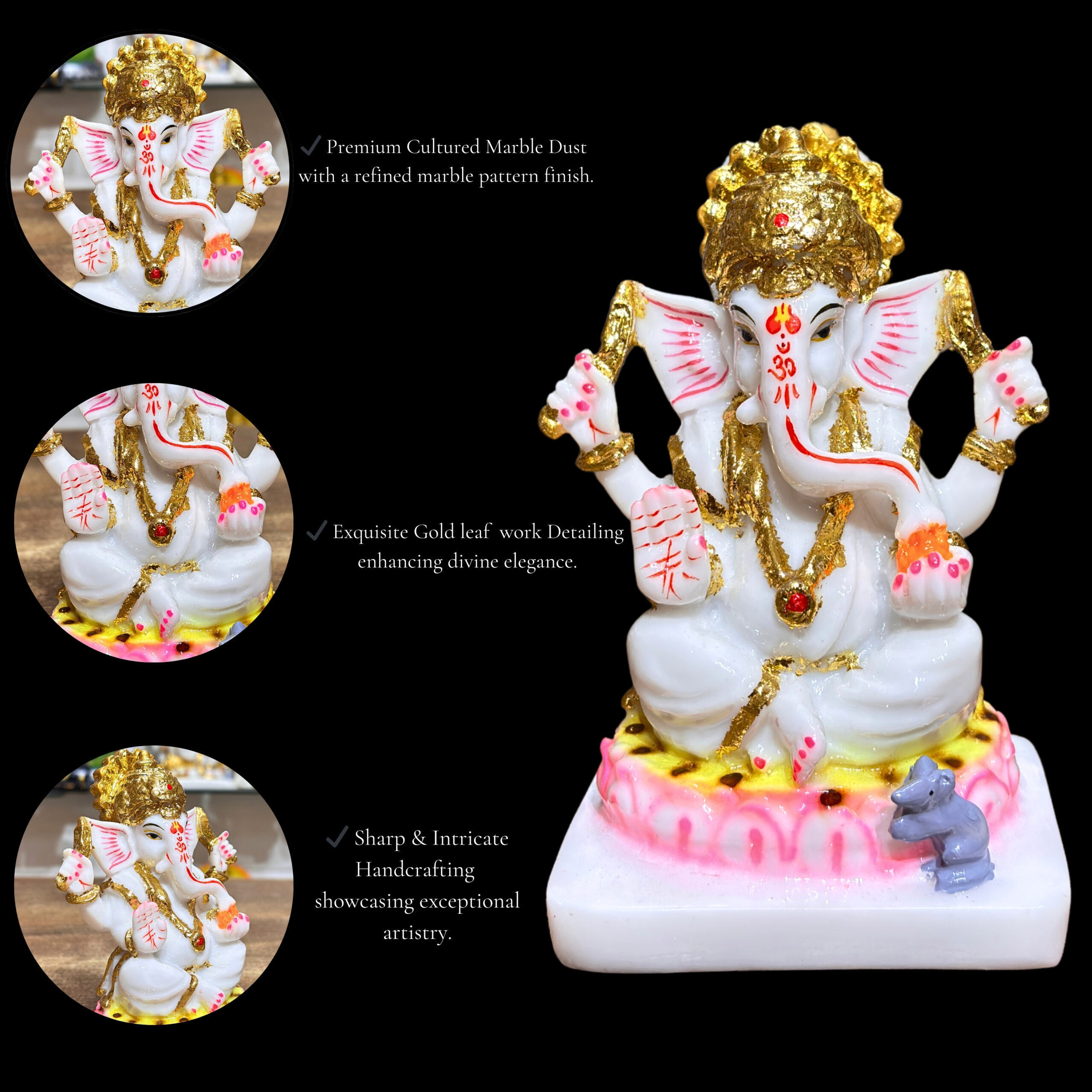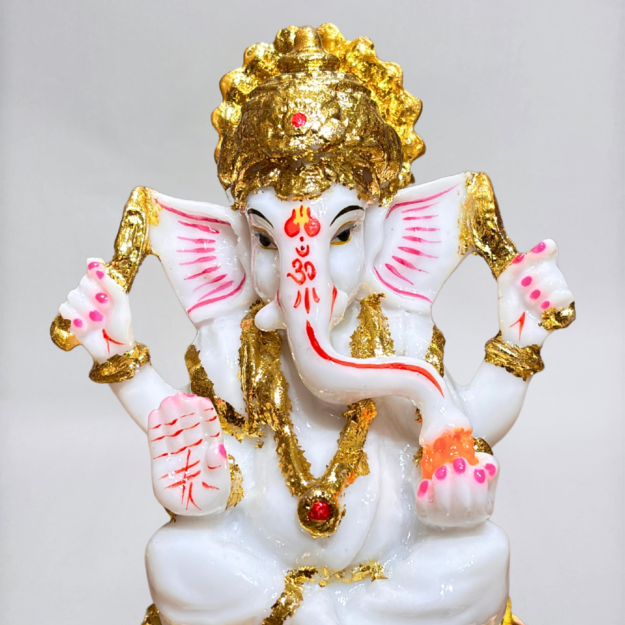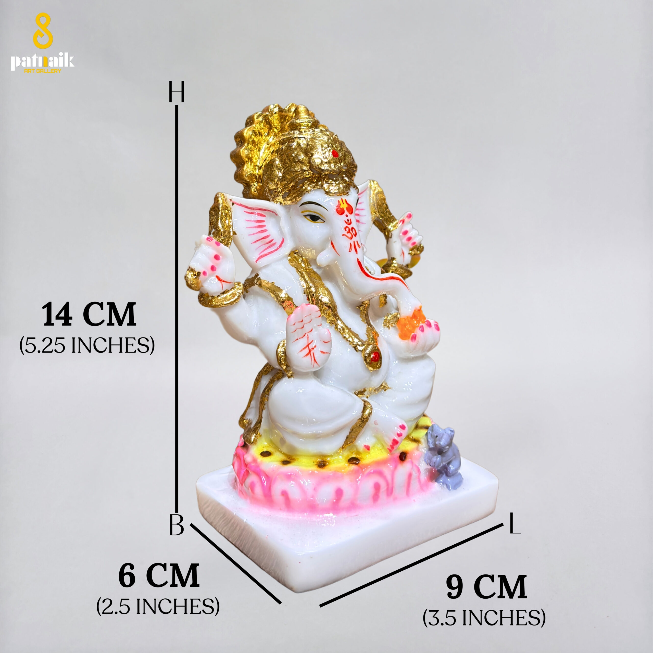 S PATNAIK 5.25 INCHES WHITE GANESHA IDOL SEATED ON LOTUS | MARBLE DUST | GLOSSY FINISH | GOLD LEAF WORK