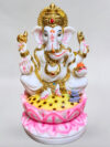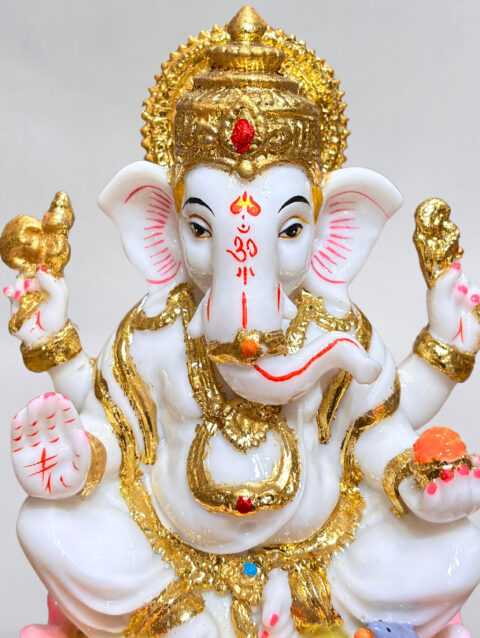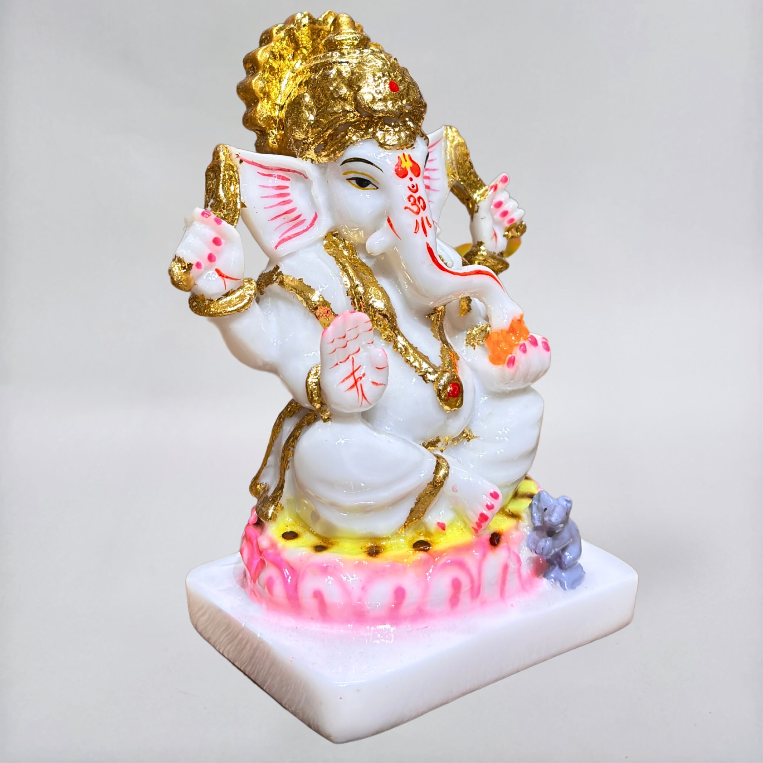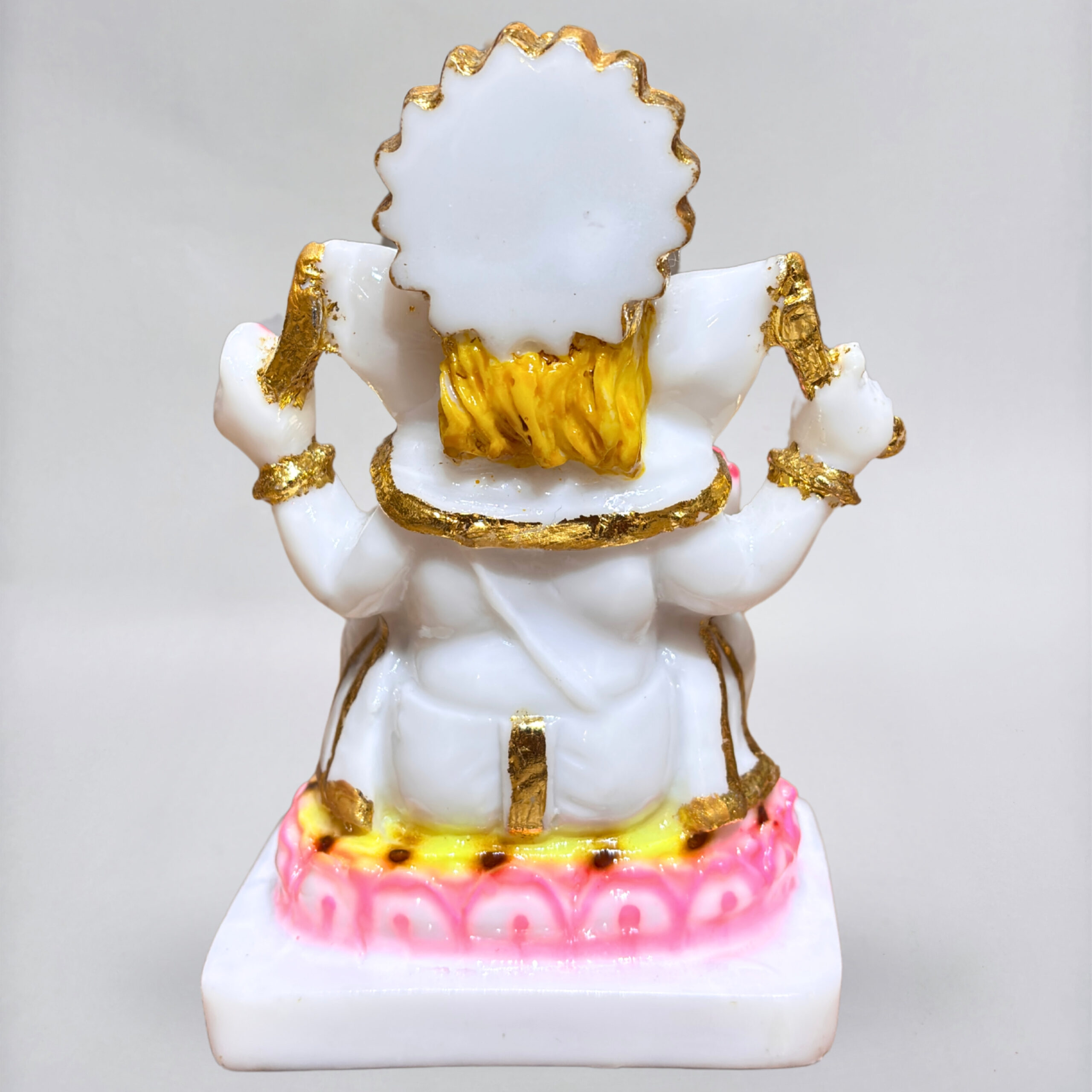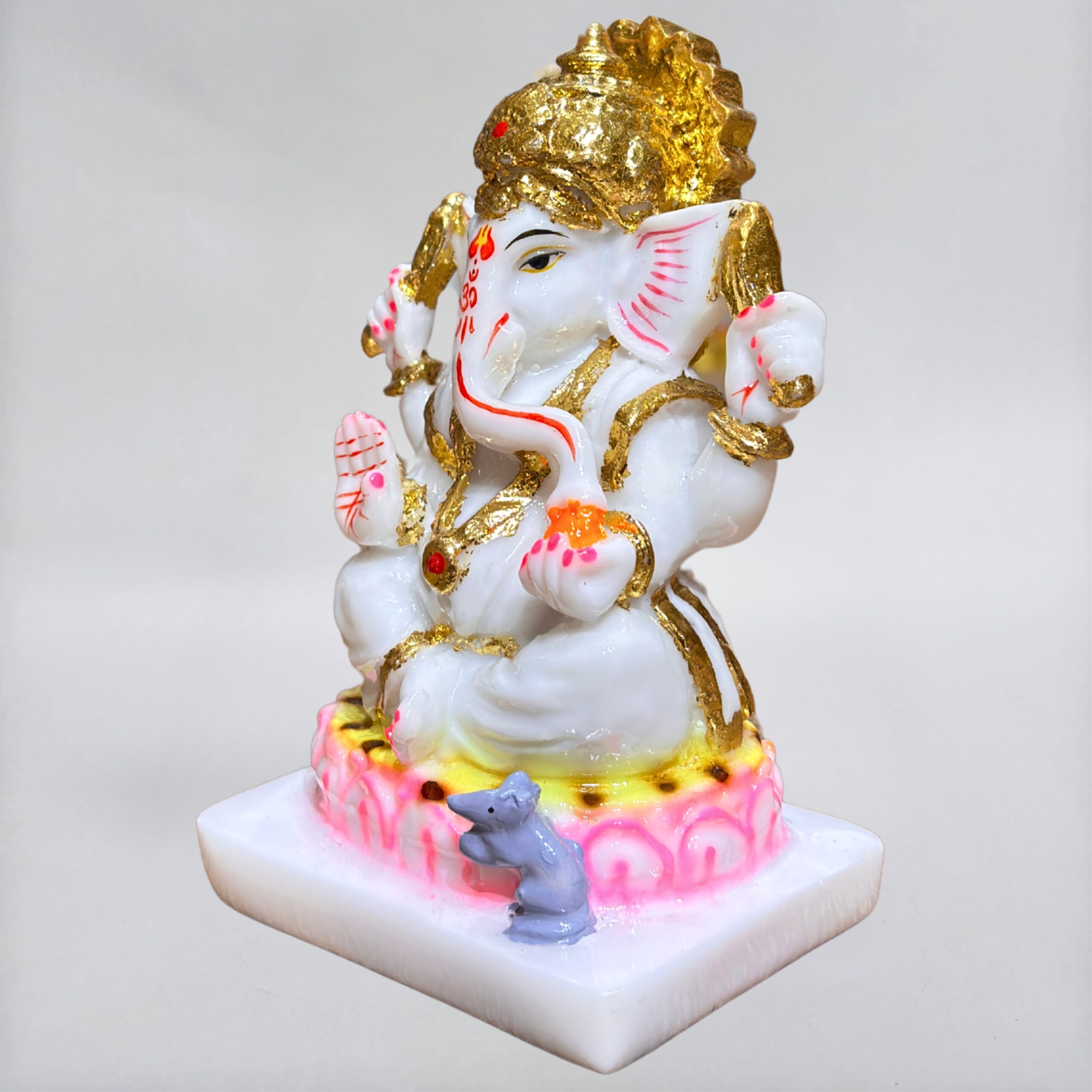 S PATNAIK 5.25 INCHES WHITE GANESHA IDOL SEATED ON LOTUS | MARBLE DUST | GLOSSY FINISH | GOLD LEAF WORK