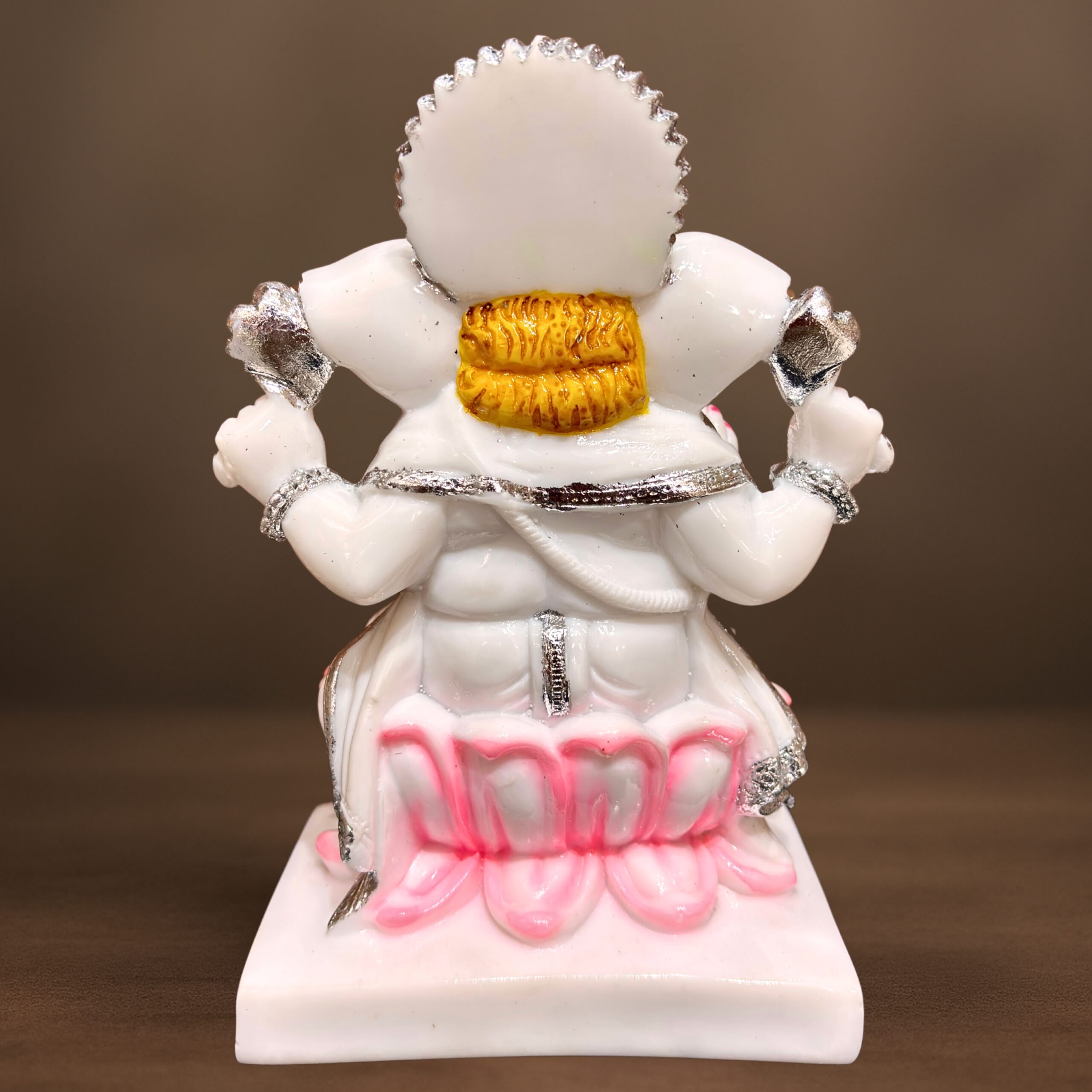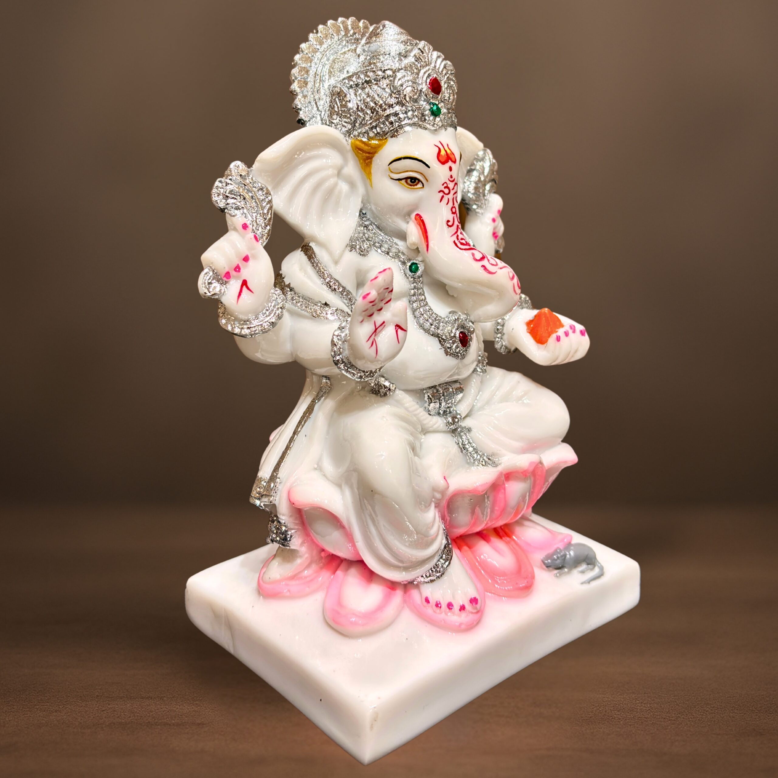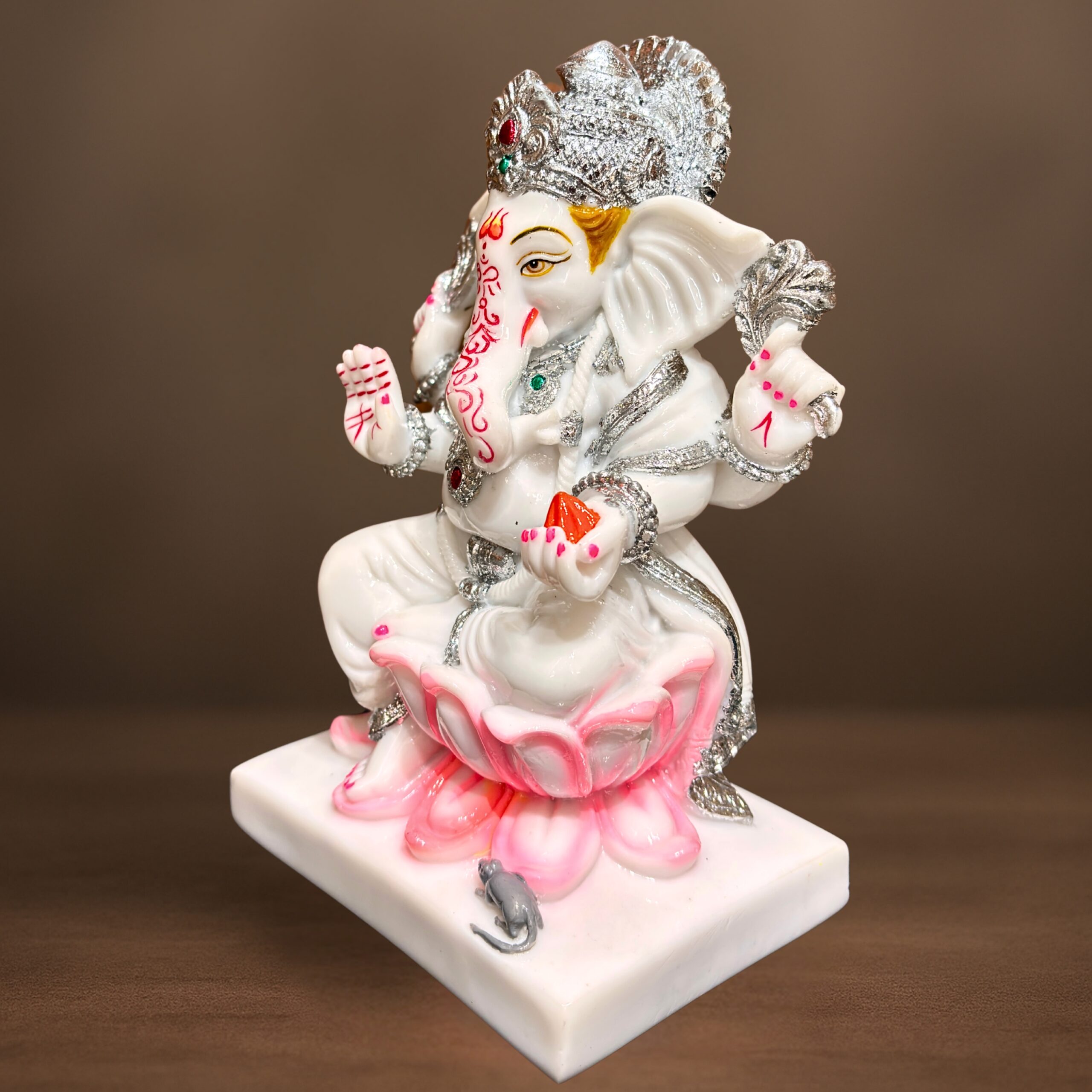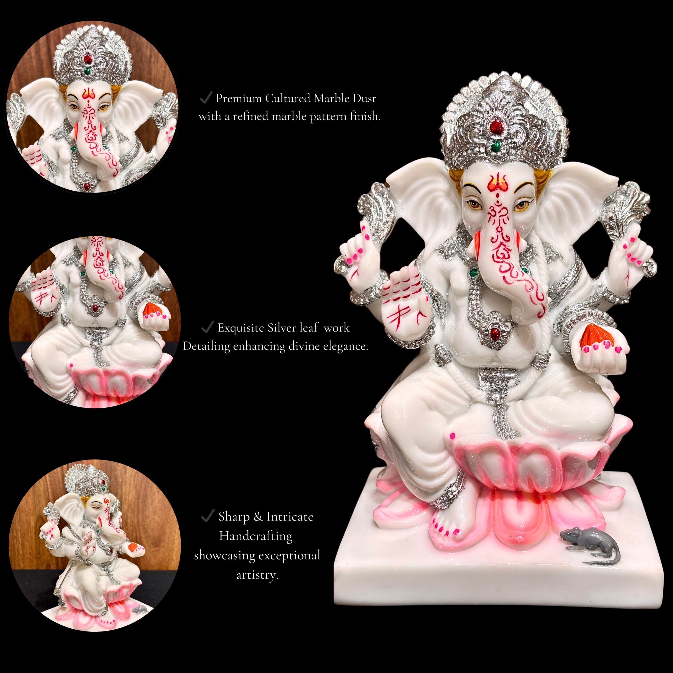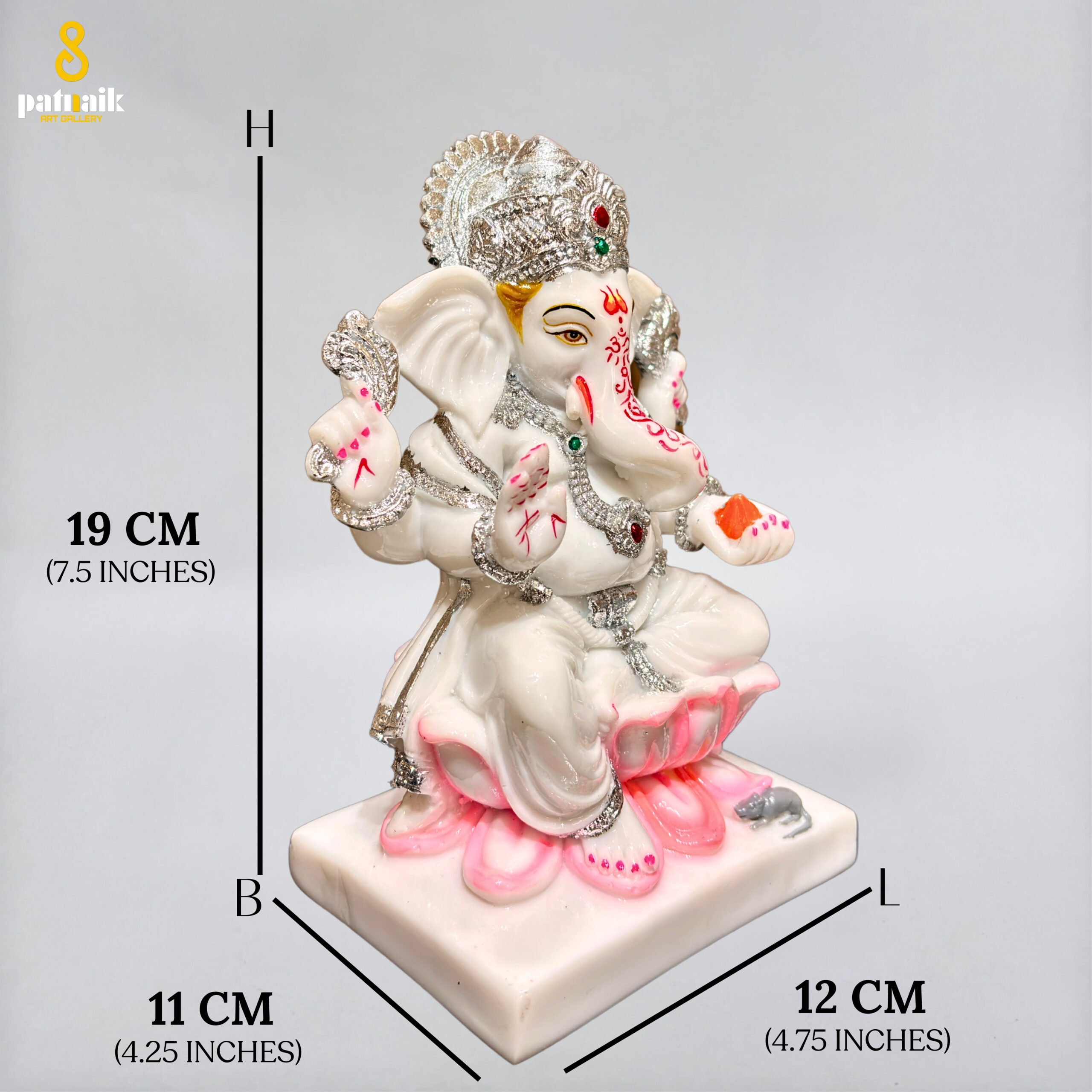 S PATNAIK 7.5 INCHES WHITE GANESHA IDOL SEATED ON LOTUS | MARBLE DUST | GLOSSY FINISH | SILVER LEAF WORK