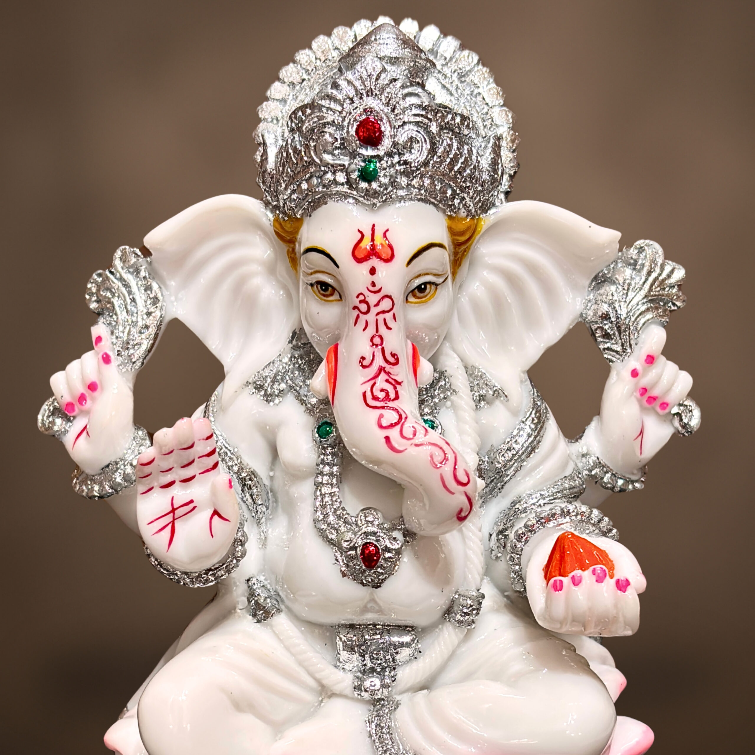 Experience divine positivity and wisdom with this beautifully handcrafted idol of Lord Ganesha, seated gracefully on a lotus base. Made from premium marble dust, this 7.5-inch murti features a pure white glossy finish with fine silver leaf work that enhances every intricate detail. The lifelike, hand-painted eyes reflect peace and devotion, making it perfect for daily pooja, home decor, or gifting.