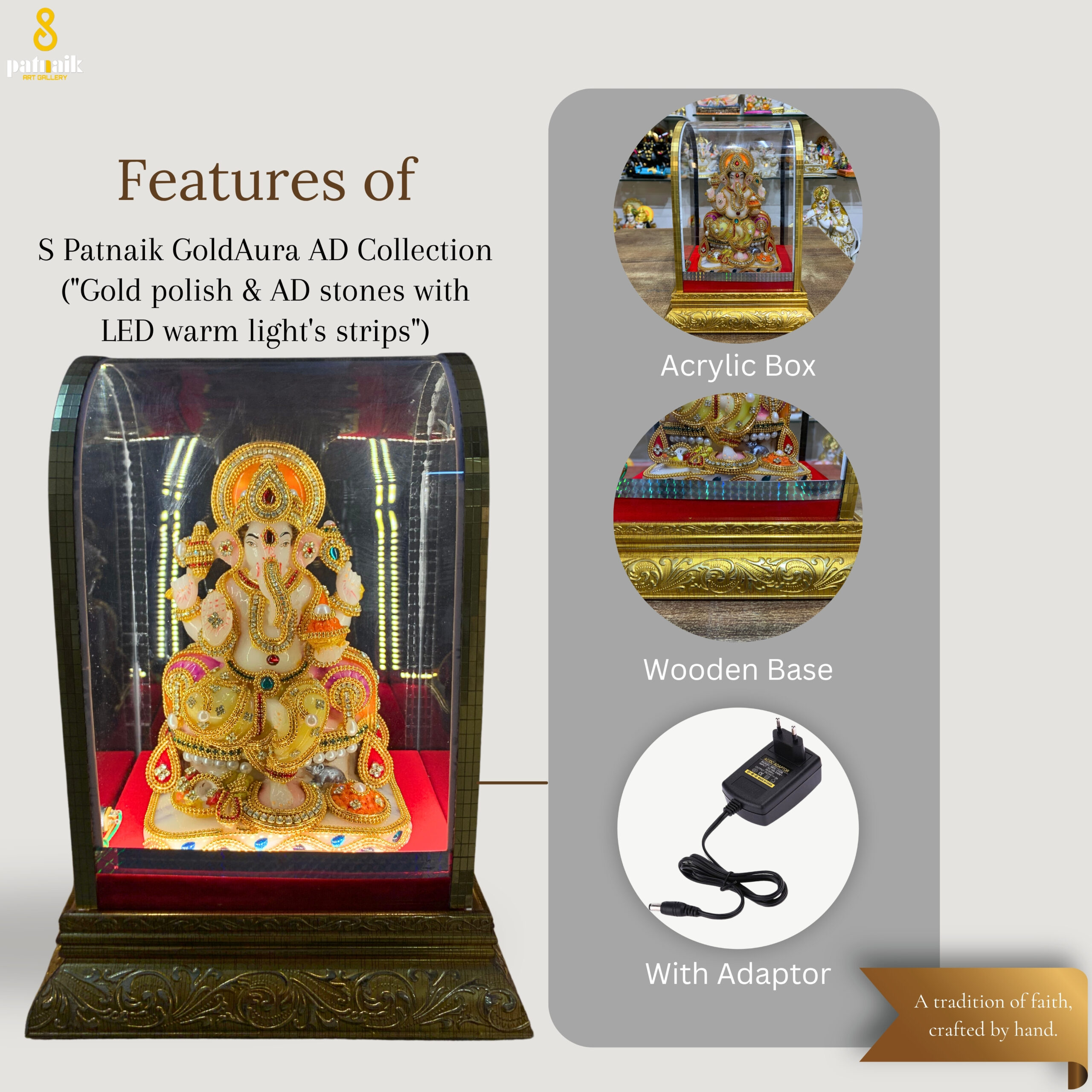 S PATNAIK MARBLE DUST IDOL WITH GLOSSY FINISH, 24K GOLD POLISH CHAIN, AD STONE WORK, LED WARM LIGHT STRIPS, ACRYLIC DISPLAY BOX, WOODEN BASE, AND VELVET CLOTH PLATFORM — PERFECT FOR POOJA, GIFTING, AND HOME DECOR