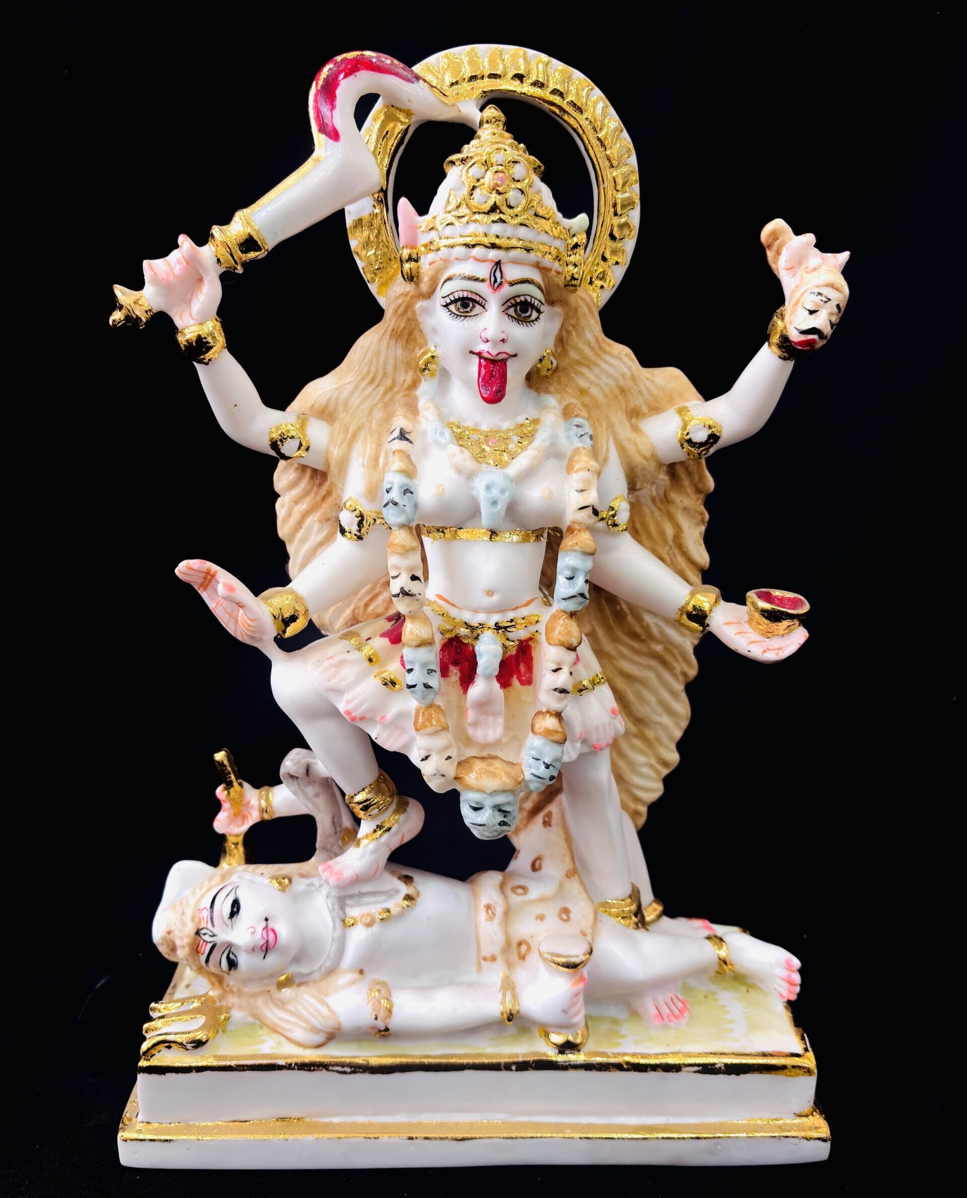 EXPERIENCE THE POWER AND GRACE OF KALI MATA, THE GODDESS OF TIME, CHANGE, AND DIVINE ENERGY. THIS EXQUISITELY HANDCRAFTED IDOL, MADE FROM PREMIUM MARBLE DUST AND ADORNED WITH INTRICATE GOLD LEAF WORK, RADIATES PROTECTION, STRENGTH, AND SPIRITUAL POWER.