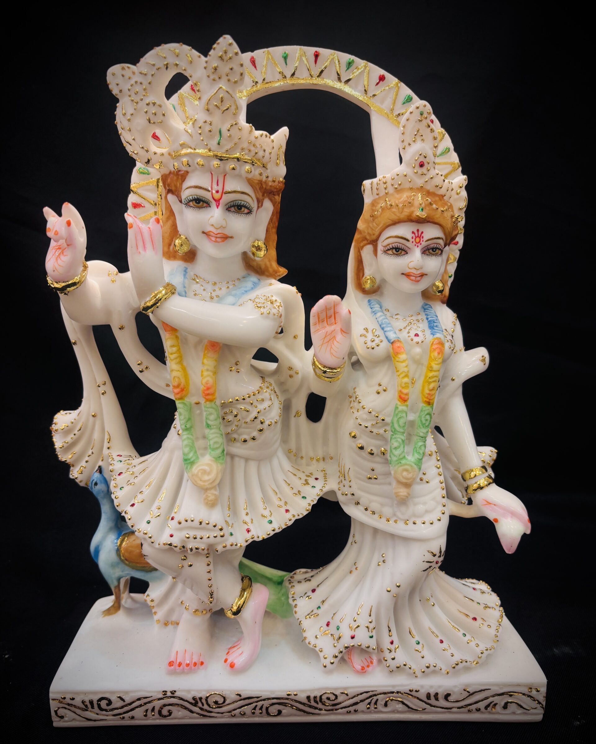 EXPERIENCE THE DIVINE UNION OF LORD KRISHNA AND RADHA WITH THIS EXQUISITELY HANDCRAFTED IDOL. MADE FROM PREMIUM MARBLE DUST AND ENHANCED WITH INTRICATE GOLD LEAF WORK, THIS MASTERPIECE REFLECTS LOVE, DEVOTION, AND SPIRITUAL BLISS.